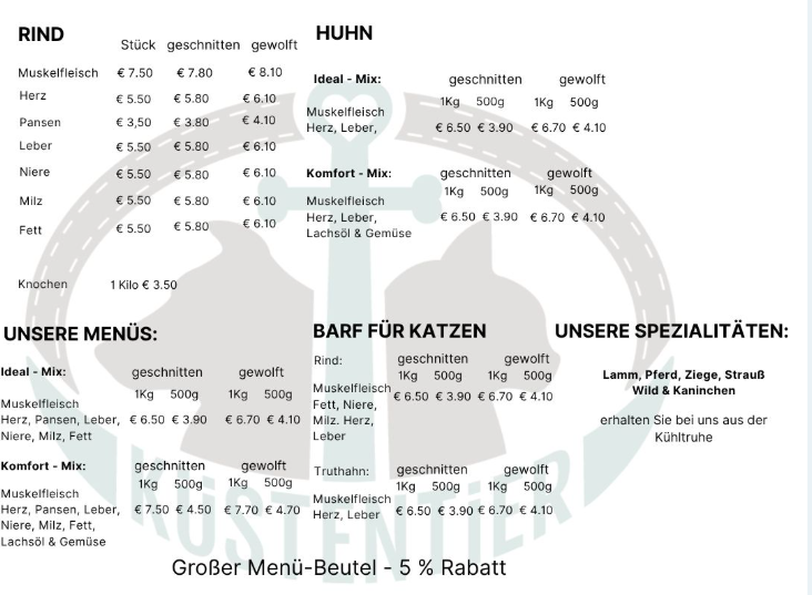 Reguläre Abholtage und -zeiten für unsere hauseigene Frischfleisch-Mischung (Rind & Huhn):