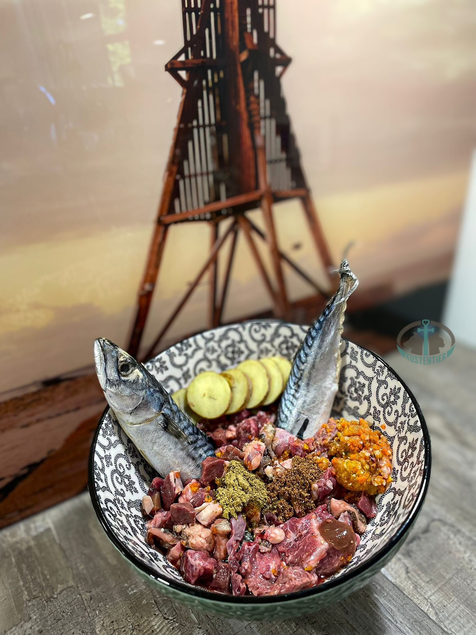 Die KüstenTier Mischungen gibt es in zwei verschiedenen Zusammensetzungen, die ideal-Mischung bestehend aus Fleisch, Fett, Pansen und Innereien sowie die Komfort-Mischung bestehend aus Fleisch, Fett, Pansen, Innereien, Lachsöl sowie Gemüse für Hunde und einer Mischung (bestehend aus Fleisch und Innereien) für Katzen.